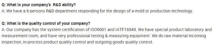 SGS، ROHS، IATF16949:2016 أو فحص طرف ثالث متاح وفقًا لمتطلبات العميل. |